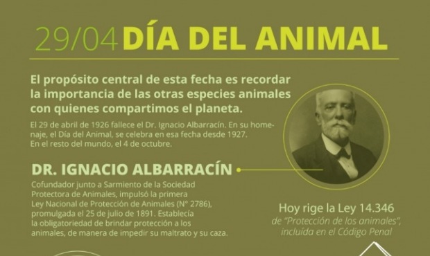 En honor al Dr. Ignacio Albarracín, fundador de la Sociedad protectora de Animales. Promulgó la primera ley nacional de protección de los animales, hoy incluída en el código penal. En nuestro país se celebra el 29 de Abril, día de la muerte del Dr. Albarracín.