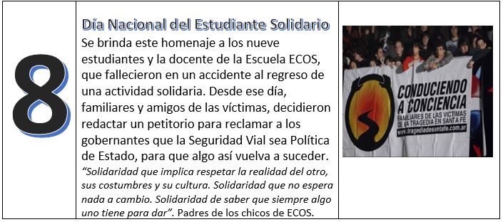Y, entendiendo que un aspecto fuerte de nuestra identidad es el Servicio, entendido como un acto de profundo amor al prójimo, se trabaja en el sostenimiento de proyectos como el Viaje Misional a Mendoza y la organización de los 11 Solidarios.